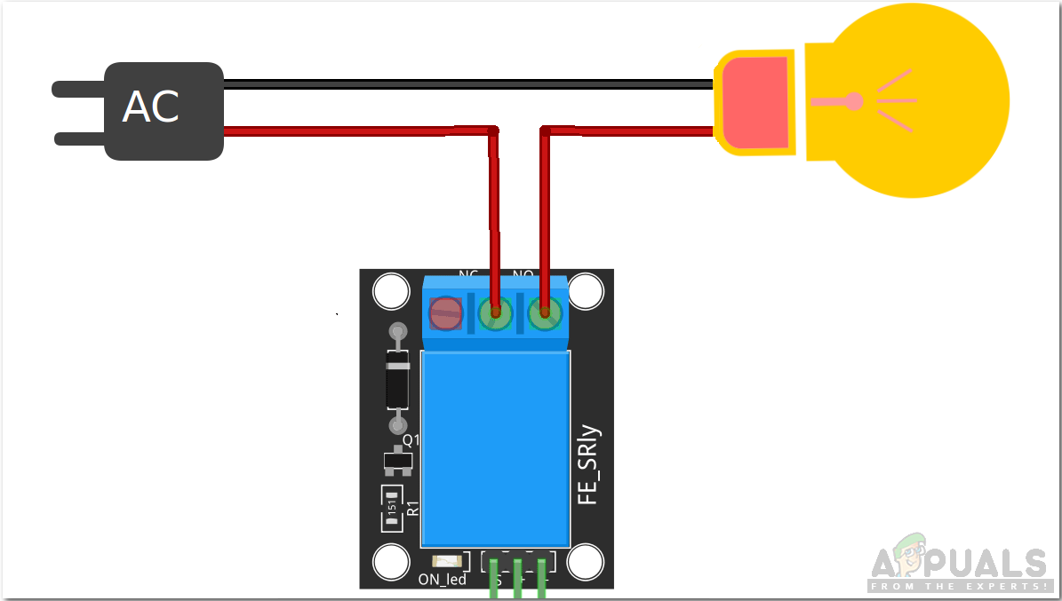 Now let’s connect the relay module to your home appliance. Take the positive wire of the appliance and cut it. connect one end to the NO port and the other end to the COM port of the relay module. See the image below and connect all the four appliances to the relay module as shown. Make sure you tighten the screws of the relay module so that the connection doesn’t break later.