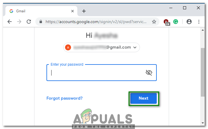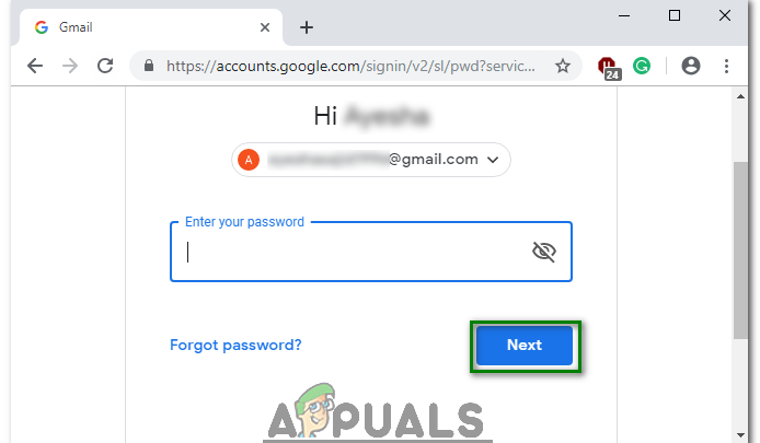 - After doing this, select your desired account with which you want to log in to Gmail, type in your password and then click on the Next button as shown in the following image:
