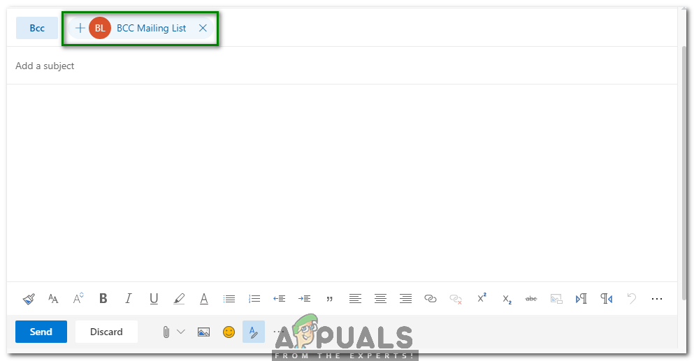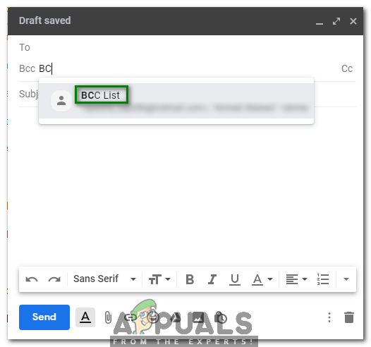 - Finally, type the name of your label in the field corresponding to the BCC heading in order to add your newly created BCC list to your email as highlighted in the image shown below: