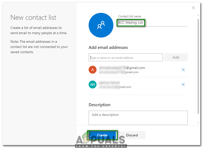 - Now add contacts to your newly created list by typing in their email addresses in the Add Email Addresses field and then click on the Create button as highlighted in the image shown above. In this example, I have added two contacts to this list.