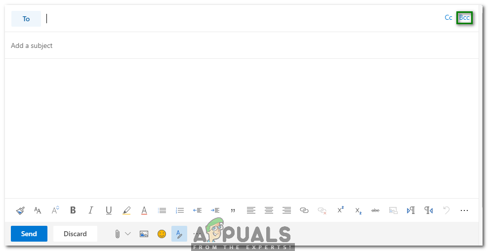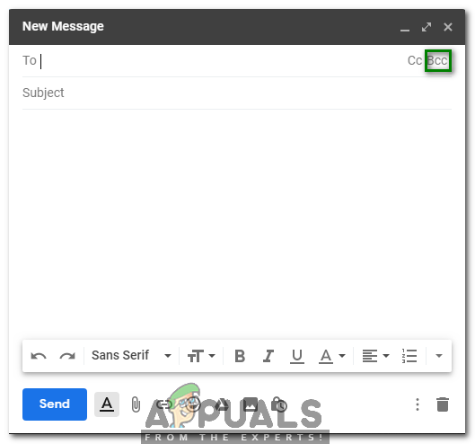 - As soon as the New Message box appears on your screen, click on the BCC icon in order to add a BCC mailing list to your email as highlighted in the following image: