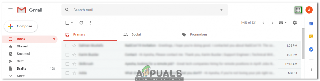 - Once you manage to log in to Gmail successfully, click on the Google Apps icon located at the top right corner of the Gmail window as highlighted in the image shown below: