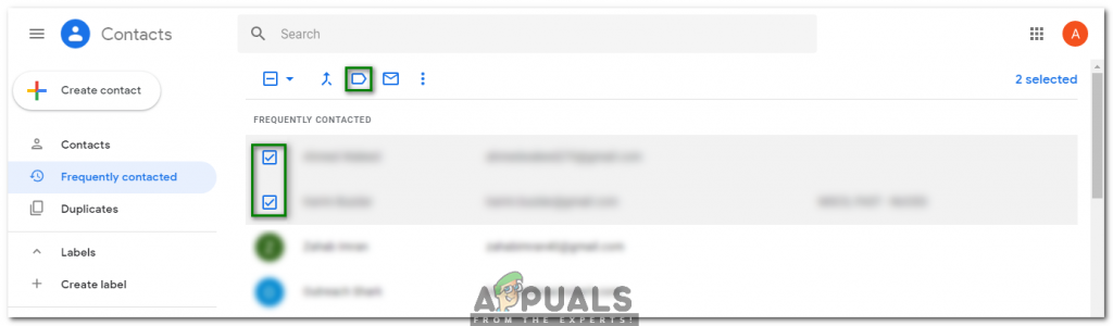 - Now select all those contacts that you want to make a part of your BCC mailing list by checking the checkbox before the contact’s name. In this example, I have selected two contacts. After selecting the contacts, click on the Manage Labels button as highlighted in the image shown below: