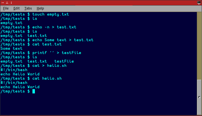 You may want to try printf ” > testFile to create a completely empty file or printf ‘\n’ > testFile to create one that has nothing but a newline character in it. Once again, this will overwrite any file with this name and thus it must be used with caution. While this isn’t significantly different from the other methods, you may see it sometimes in scripts. On some older Linux distributions as well as some other implementations of Unix, the echo -n command won’t strip out newlines, so this is another reason to occasionally resort to this method. Using the touch command by itself, however, is almost always easiest.