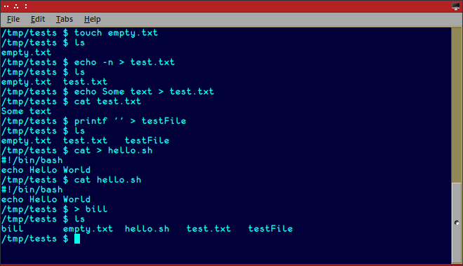 Again, keep in mind that you could be using any file names that you’d like here. These tricks are in no way limited to writing scripts or anything else of the sort. You can be pretty creative when applying them. You could even do this more exotically if you ever had any need to. For instance, you may want to use cp /dev/null bill instead of the above, so that you could literally copy Linux’s special device file to the new file, which is naturally blank. This once more does the same job that touch would have.