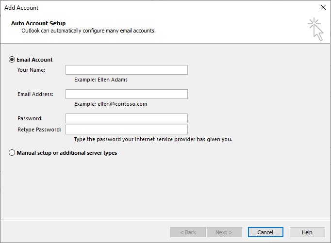 - Opt for automatic profile creation by selecting the Email Account option, or choose Manual Setup to create IMAP or POP profiles with additional settings manually.