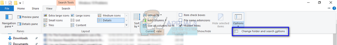 - Press Windows + E to pop up Windows Explorer. Select “View” tab, click on “Options” and select “Change folder and search options”.