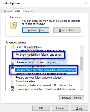 - Uncheck the option “Hide protected operating system files (Recommend)” and check “Show hidden files, folders, and drives”.