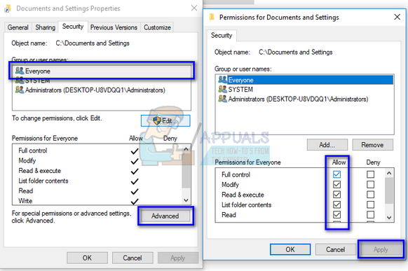 - If you are unable to open the folder, it means you have no access to it. Right-click on it and select “Properties”. Click on the “Security” tab, highlight “Everyone” and click “Advanced” so we can change the permissions. Check “Full control” and click “Apply”. After saving changes, exit the window. You will now be able to access the folder.