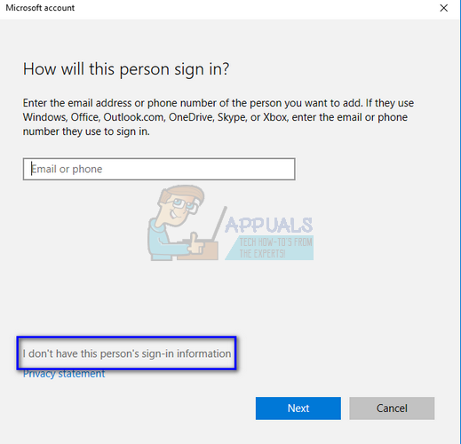 - Now Windows will guide you through its wizard on how to create a new account. When the new window comes forth, click “I don’t have this person’s sign-in information”.