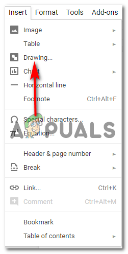 Starting on a bank document - On the top toolbar on Google Docs, click on Insert and then click on ‘Drawings…’ to be directed to more drawing options for your page.