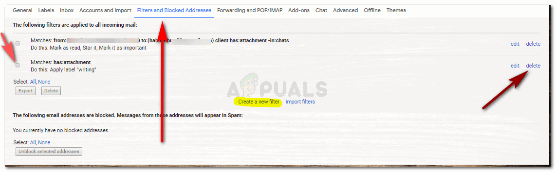 Click on settings again. - Click on the ‘Filters and Blocked Addresses’ as shown in the picture below. The filters that you created will appear here. You can edit it from the same place, you can delete it, you can also create new filters from the ‘create filter’ tab that has been highlighted in the following picture. By editing, you can change the functions of the filters that you have already created. This is a better idea than deleting the filter and creating it from the scratch all over again.