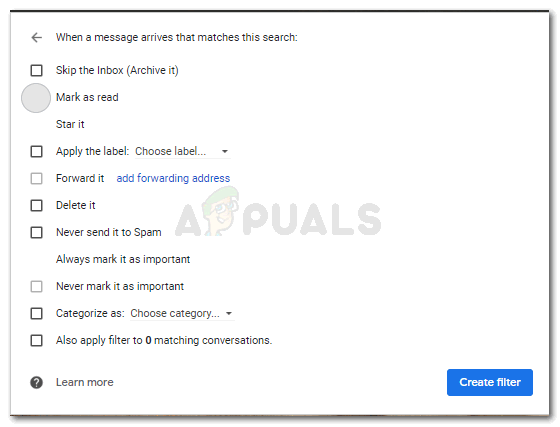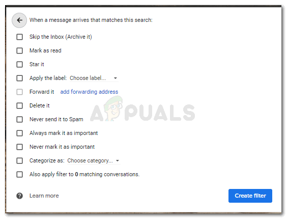 - Clicking on ‘Create Filter’ will bring me all the options of actions that I want my filter to take. From skipping the inbox, star the email as important, sending it to a certain label, deleting it and even sending it to the spam folder.I can choose what I want this certain filter to do and it will follow the instructions every time it finds an email from this certain email ID.
