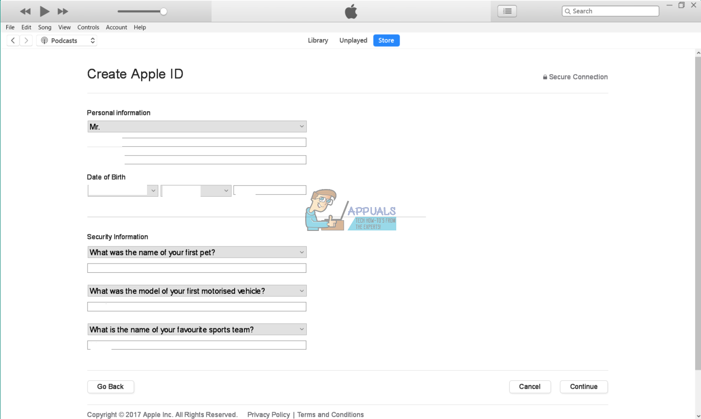 - Follow the on-screen instructions to set up your free Apple ID. Make sure you put all the information right and choose a secure password. The best practice is to use Numeric and Special characters, as well as Capital words. I recommend writing down your email and password on a piece of paper and keep it somewhere handy. If you forget your email and reset your iDevice, it gets stuck on the iCloud login screen. There is no way to bypass that without your correct login credentials. Additionally, for an extra layer of security, pick your security questions carefully, enter your birthday and click on the Continue button.