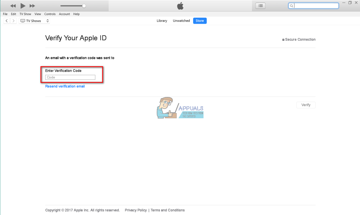 - Click Continue and iTunes will require entering the Verification Code that you have received in your email.