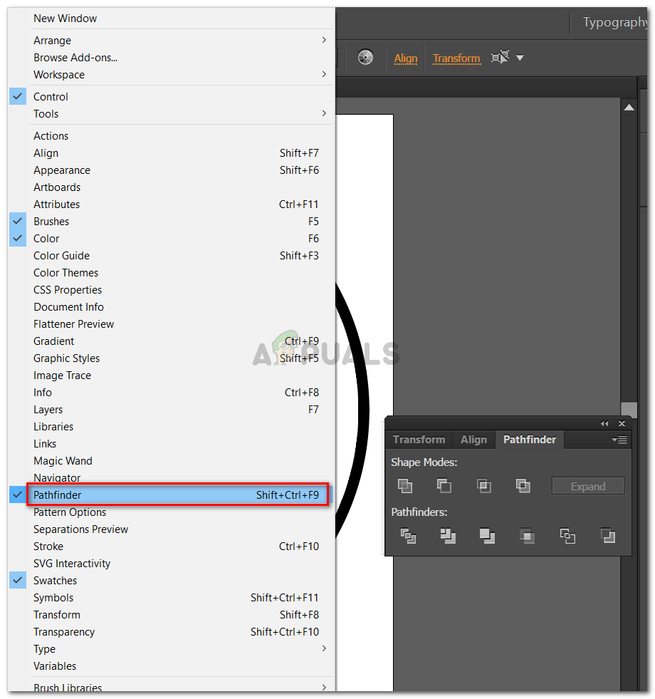 - After creating the outline strokes, you will select the three layers for the lines (the cuts in this case), and group them to make them one single shape. One these three lines have been grouped, you will now select the circle as well, but you will not group it now. You will open the Pathfinder, which can be accessed through the Windows tab on the top toolbar.