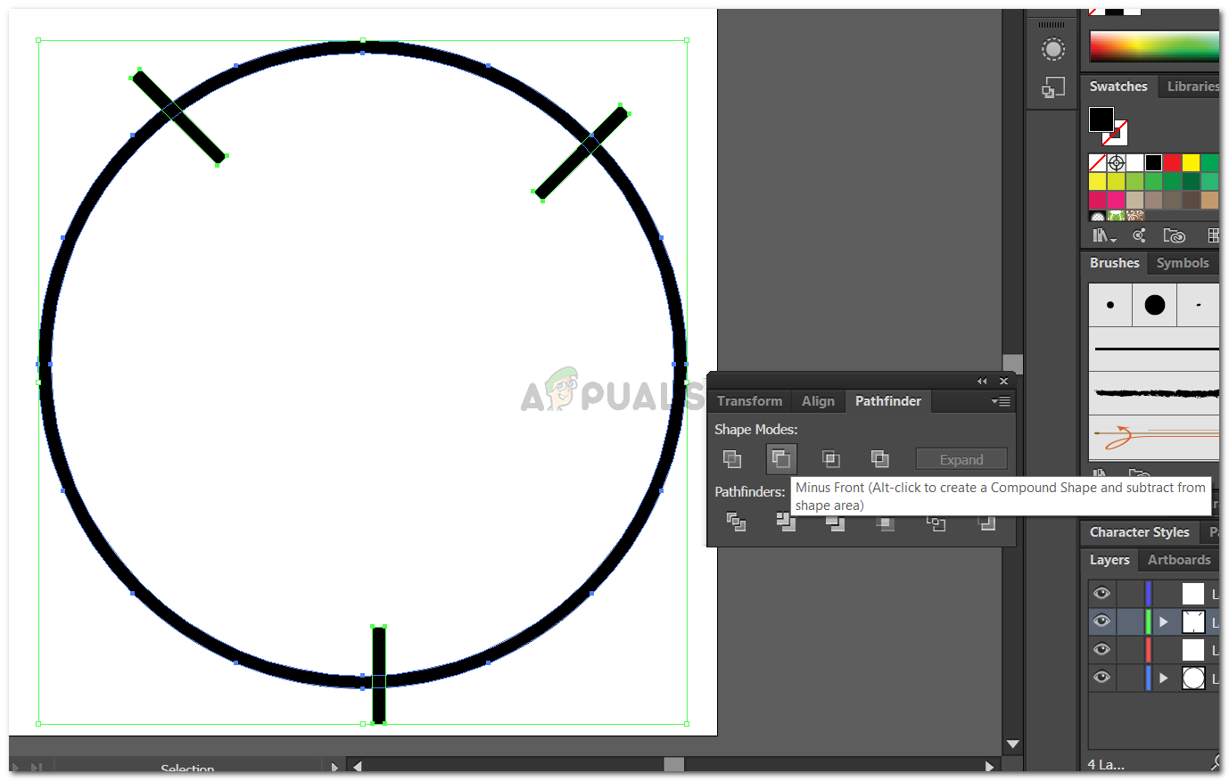Pathfinder - To create the cuts on the circle in places of the lines, you need to click on the option from Pathfinder which says ‘Minus Front’.
