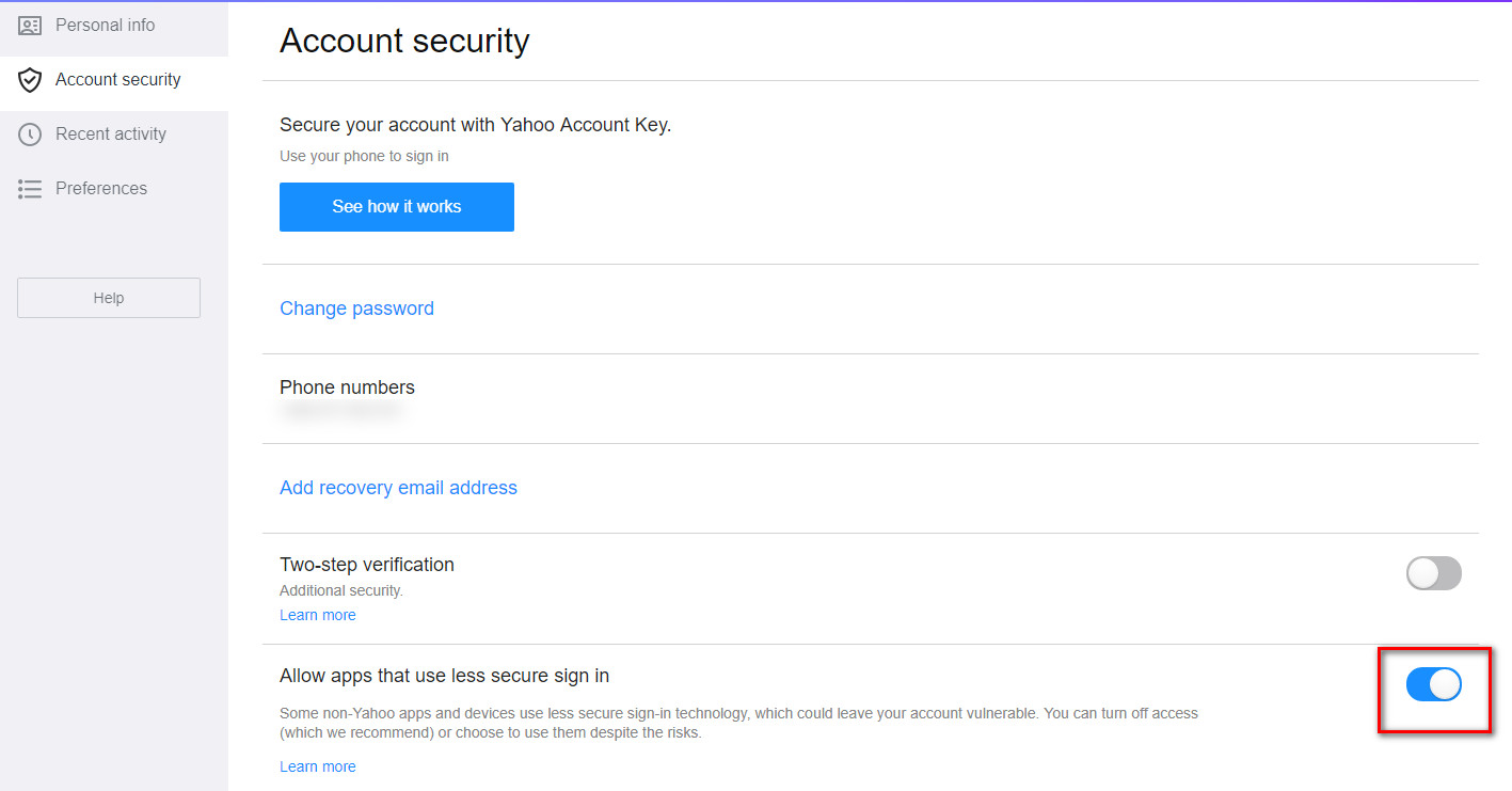 - Go to Yahoo Account Security, and turn on the toggle “Allow apps that use less secure sign in.”