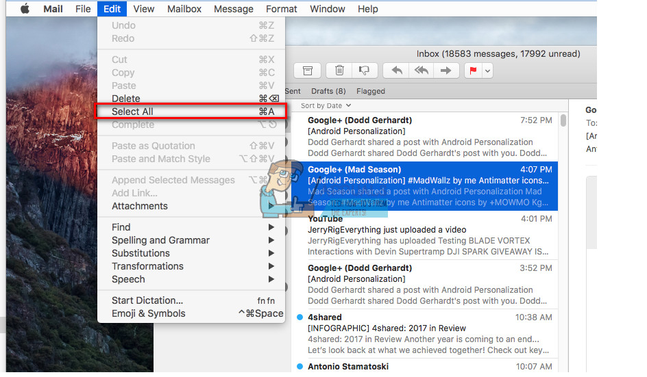 - Click Edit in the menu bar and choose Select All or click the Mac Command Button (⌘)+A on the keyboard.