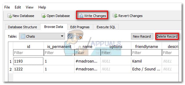 - Now change active table to Conversations and look for the Skype id with which you had the conversation under the identity column. Select it via the number on the left, then click on Delete Record followed by Write Changes.