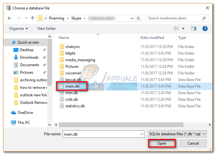 - Navigate to C: > AppData > Roaming > Skype > “Your username”, click on main.db to select it, then click Open.