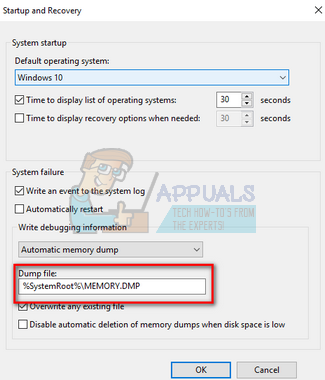 - As we can see in the Dump file dialogue box, the dump files are being saved in the system root folder. Click on the drop-down present on top (Automatic memory dump in this case); you will be able to select the type of dump files and check where each one of them is being stored.