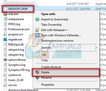 - Search for the file name (MEMORY.DMP) and delete You might require administrative privileges to perform this action.