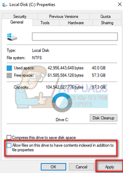 - Once the properties are opened, uncheck the option at the bottom which says “Allow files on this drive to have contents indexed in addition to file properties”. Press Apply to save changes and exit.