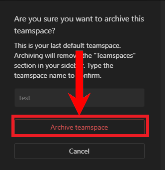 A dialog box will appear asking for confirmation. It will ask you to enter the teamspace’s name. Do so adn then click on Archive teamspace.