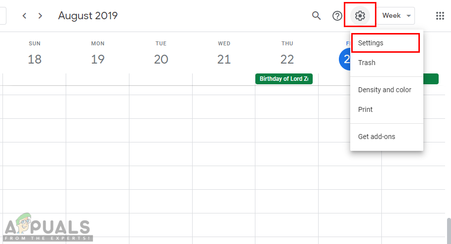 - Click the Settings icon on the top right corner and choose Settings to open the Google Calendar settings.