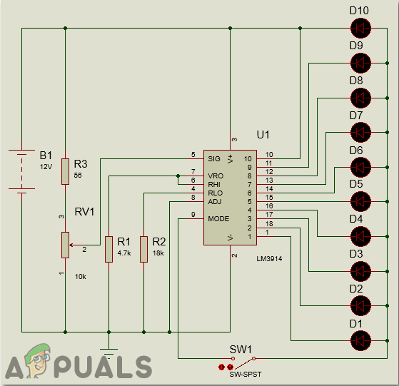 In this circuit LED’s (D1-D10) shows the limit of the battery in either dot mode or display mode. This mode is chosen by the outer switch sw1 which is associated with the ninth pin of IC. sixth and seventh pins of IC are associated with the ground through a resistor. The brightness of the LEDs is controlled by this resistor. Here resistor R3 and POT RV1 structures potential divider circuit. Here in this circuit, calibration is done by setting the knob of the potentiometer. There is no need for any outer power supply to this circuit.