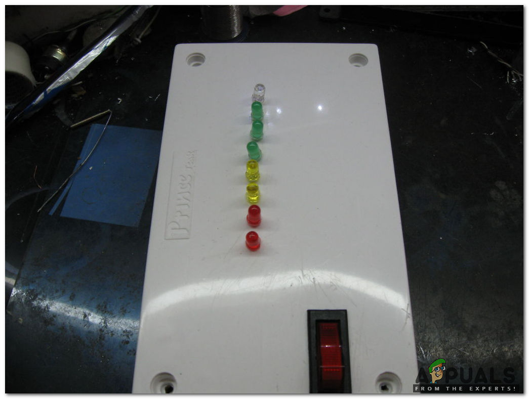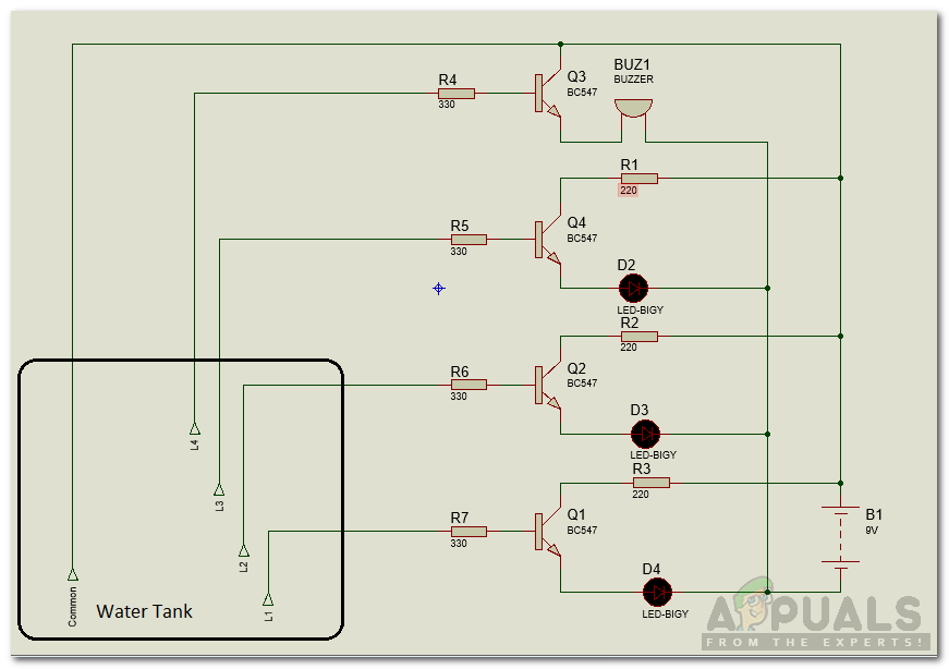 Presently, as the water ascends the sensors begin to get in contact with the water and the transistors are activated and there is a progression of current in the transistors making the LED’s light up. There is a current limiting resistor involved between transistor and LED and it prevents higher voltage to destroy the LED. LED’s light up from Red to Yellow and then Green and finally Blue, thus making a sound.
