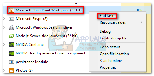 Note: In Windows 10, disable Microsoft SharePoint Workspace.