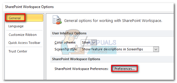 - In SharePoint Workspace Options, expand the General tab and click on Preferences.