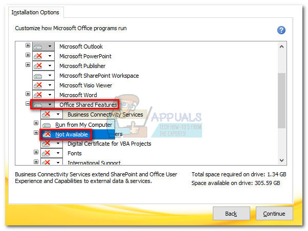 - Scroll down and expand the Office Shared Features menu. Then, expand the drop-down menu next to Business Connectivity Services and set it to Not Available. Hit Continue to proceed.