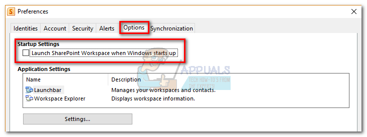 - Under Preferences, select the Options tab and disable the box under Startup Settings. Once SharePoint Workspace is prevented from launching at Windows Startup, hit Ok and close SharePoint.
