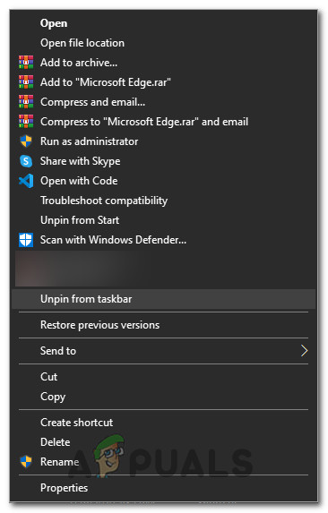 - Right-click on the “Microsoft Edge” option from the list and select the “Unpin from Taskbar” button.