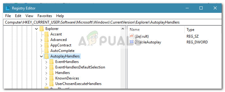 Note: In case anything goes wrong, go to File > Import and select the backup that you previously created to restore the Registry to a healthy state. - Using the left pane of Registry Editor, navigate to the following location: HKEY_CURRENT_USER \ Software \ Microsoft \ Windows \ CurrentVersion \ Explorer \ AutoplayHandlers
