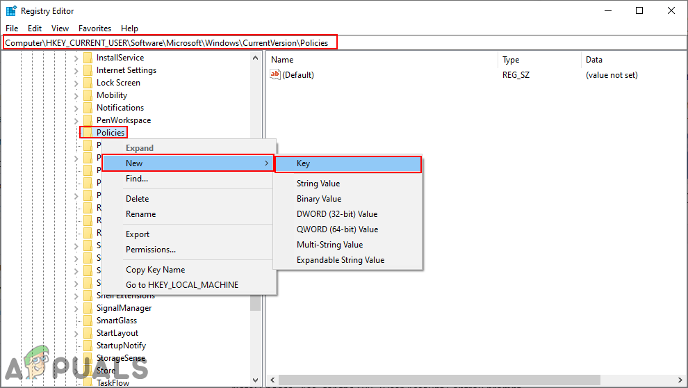 - If the “Explorer” key is missing, you can simply create it by right-clicking on the Policies key and choosing New > Key. Name the key as “Explorer“.