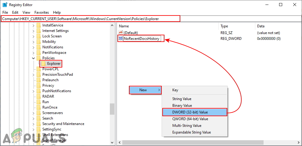 Creating a missing key - Select the Explorer key, right-click on the right pane and choose New > DWORD (32-bit) Value. Name this value as “NoRecentDocsHistory“.