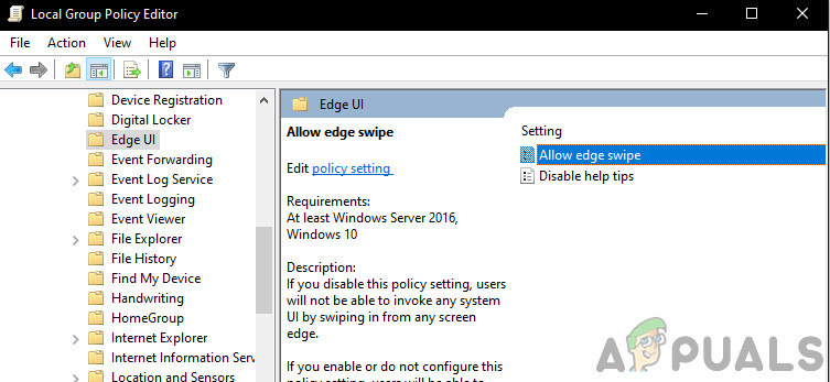 Edge UI - In the right pane, double click on Allow edge swipe to edit the feature.
