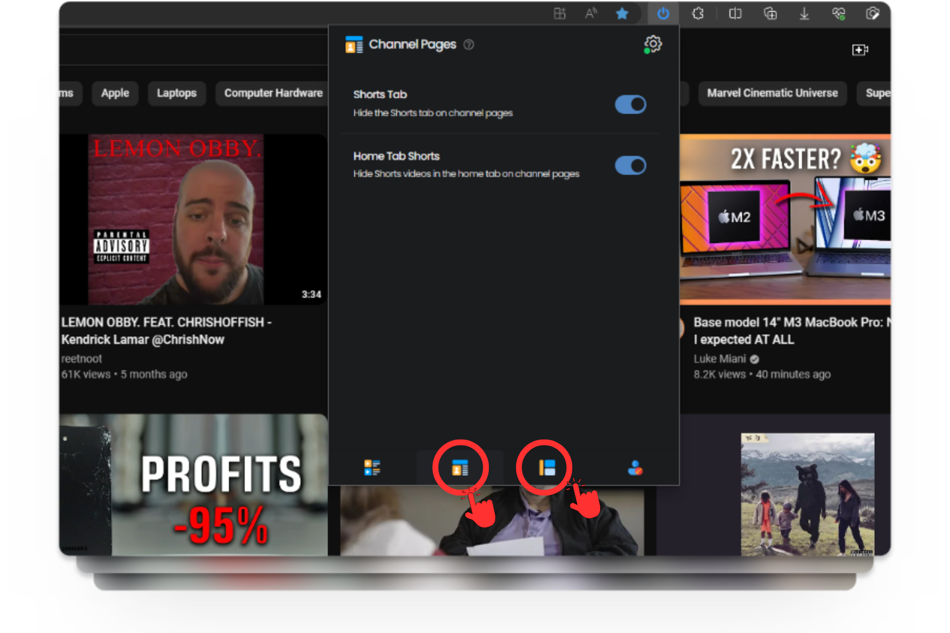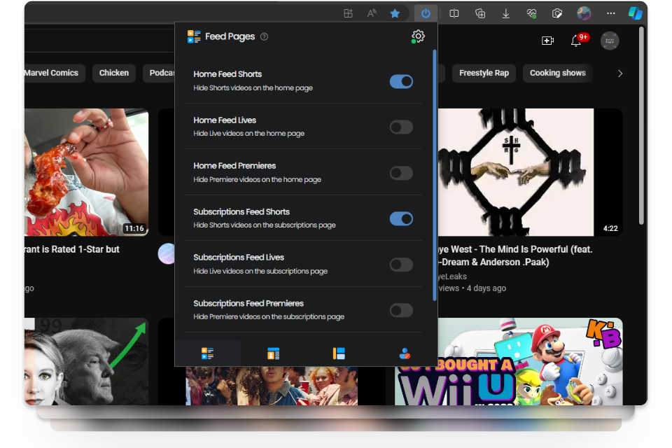 Make sure to switch tabs (from the bottom) within the extension menu to get to the other Shorts option for “Channel” and “Miscellaneous” controls.