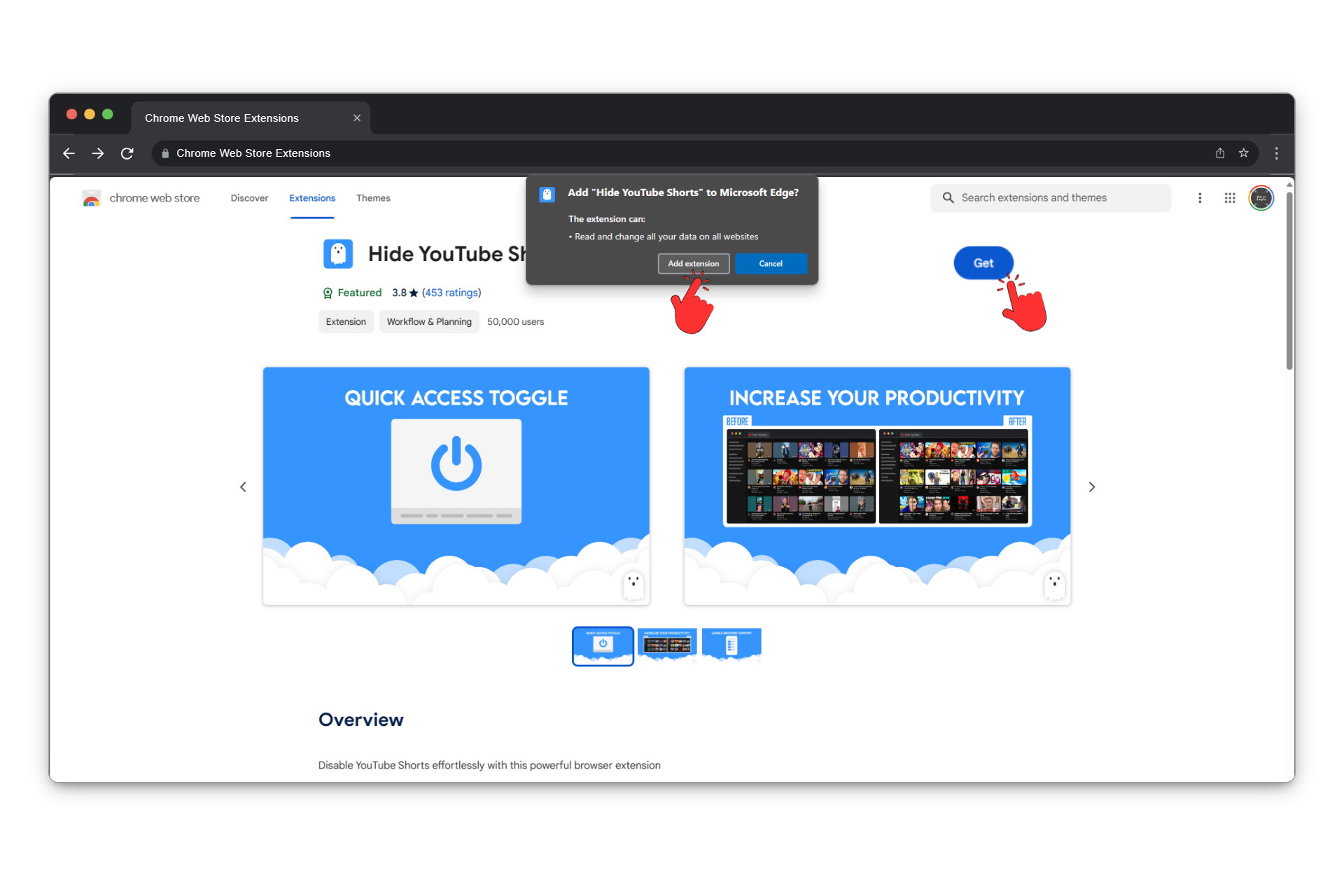 Open the extension page using the button above. Install it by clicking on the Get button. You might be asked for confirmation, so just select “Add extension.”
