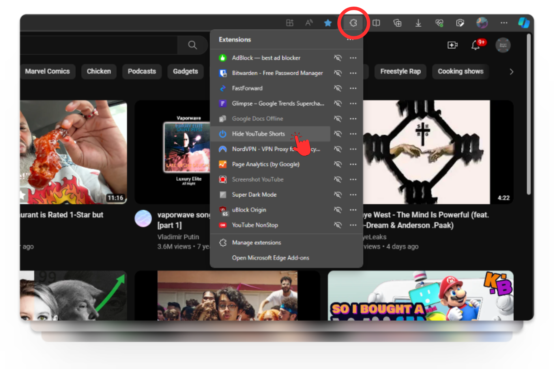Once the extension is installed, visit YouTube’s homepage and click on the Extensions icon (a puzzle piece icon at the top). Look for Remove YouTube Shorts.