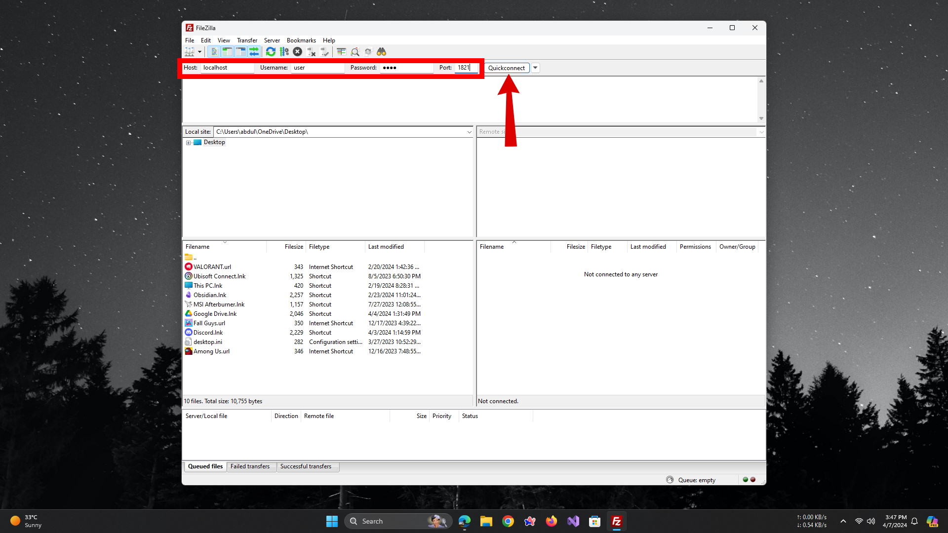 - At the top of FileZilla, locate the fields labeled Host, Username, Password, and Port.