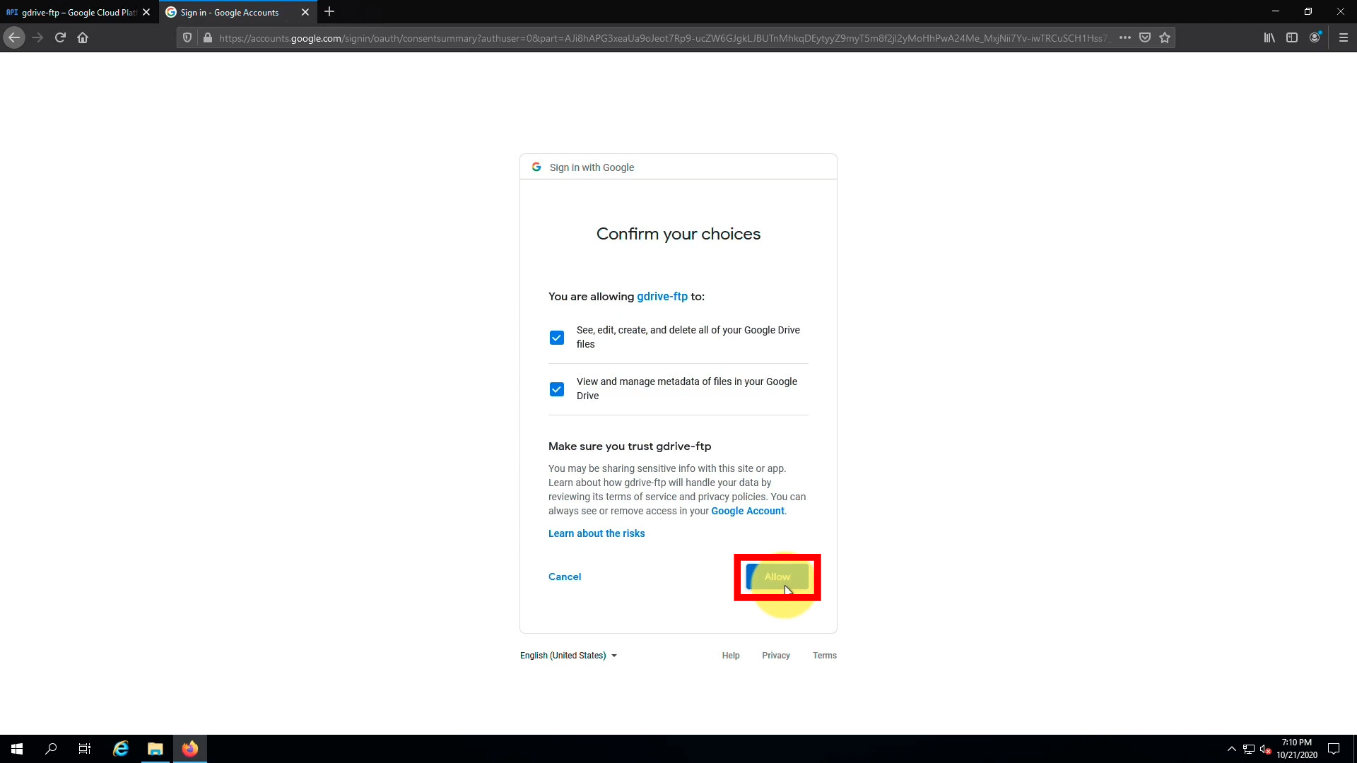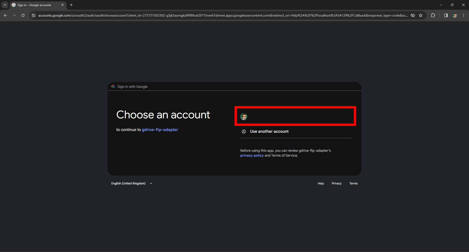 - When prompted, authorize Google Drive FTP Adapter through your browser to allow secure access to your Google Drive account. Follow the instructions so the adapter can manage files on your behalf.