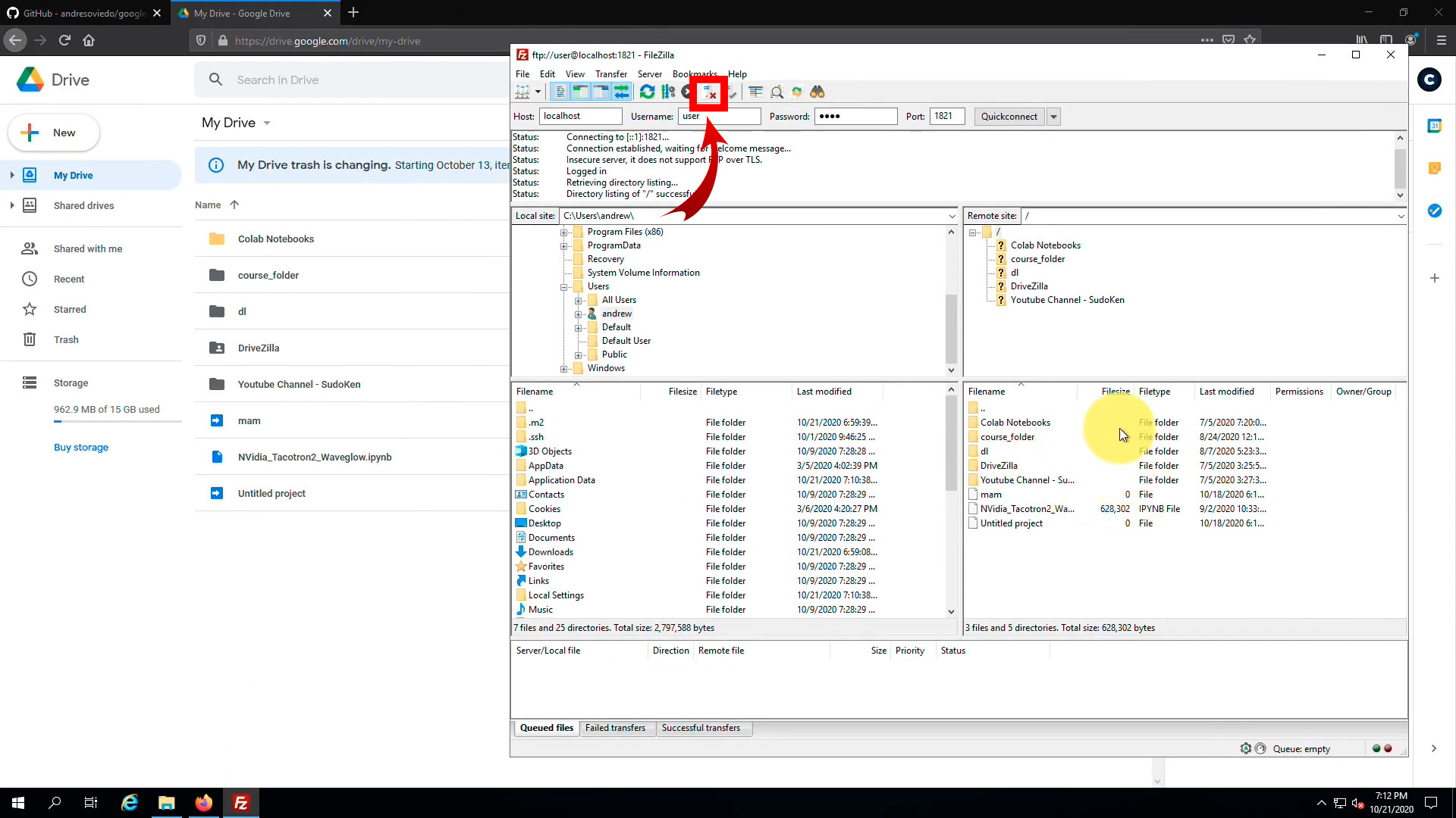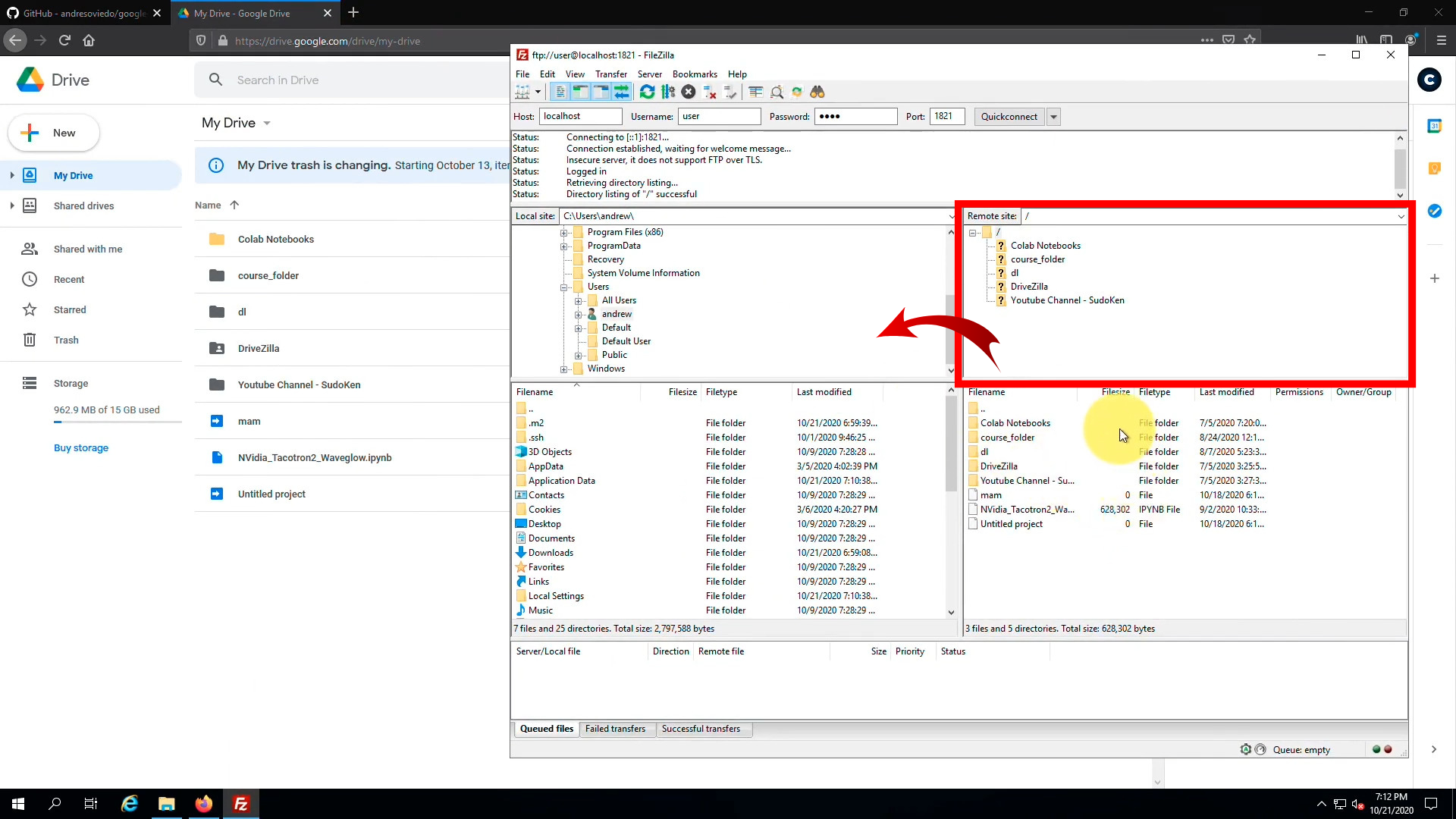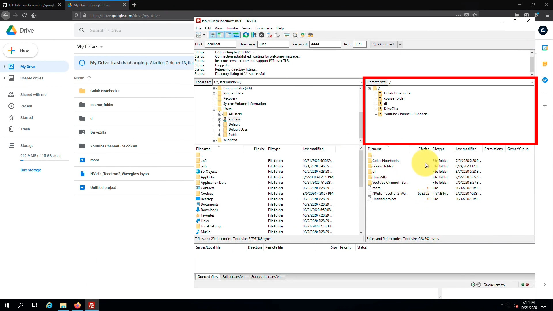 - You can also rename, delete, and create new folders in Google Drive directly from within FileZilla.