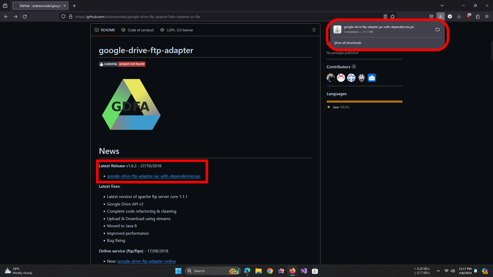 - From the latest release section, download the ‘google-drive-ftp-adapter-jar-with-dependencies.jar’ file, which contains all necessary dependencies.