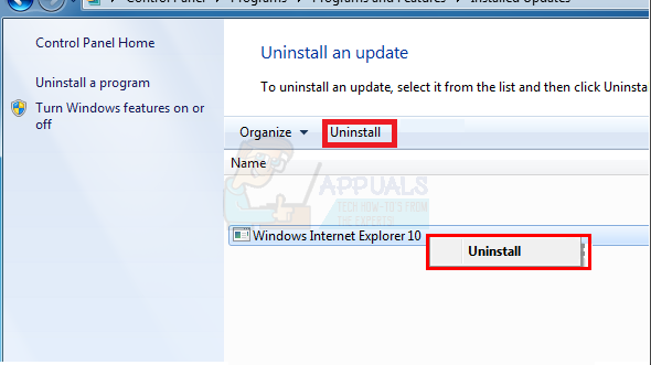 - Select the Internet Explorer entry and select Uninstall. If you have both 10 and 11 then uninstall both.