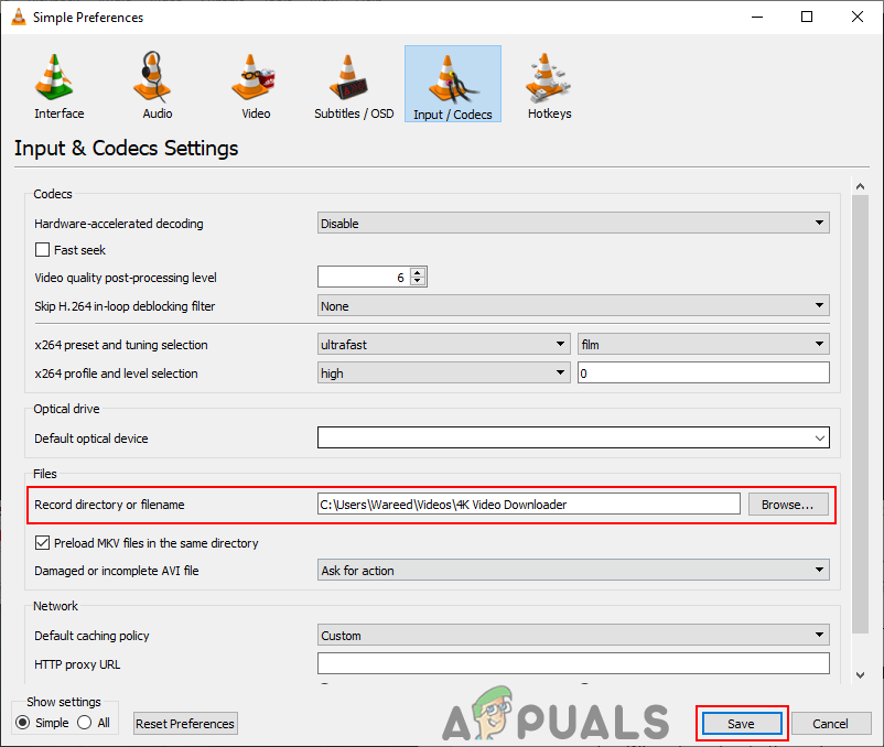 Changing the directory - Click on the Save button to save the changes for VLC recorded files directory.